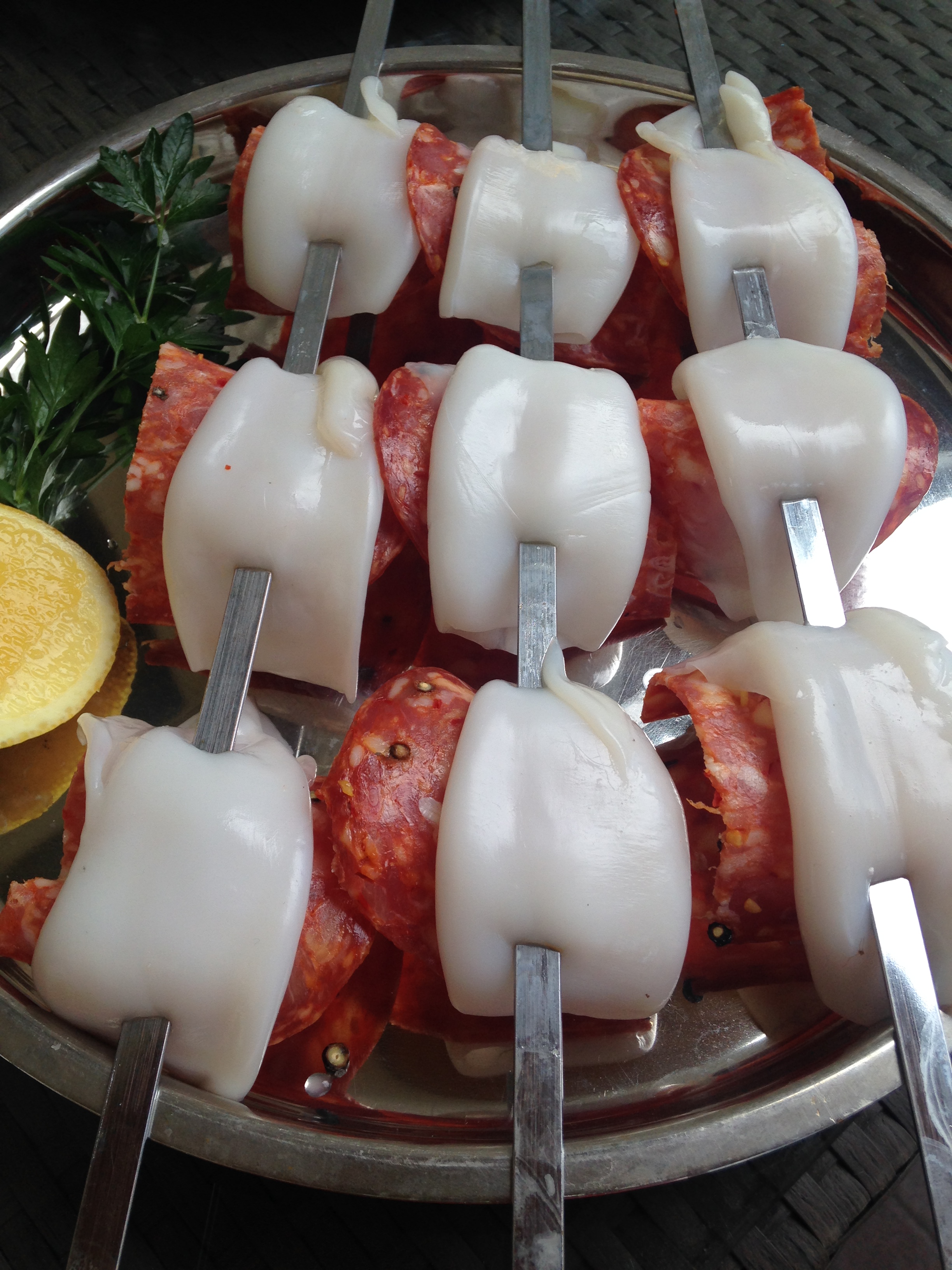 Marry baby calamari tubes with a slice of hot salami or any cured meat, BBQ or grill over very hot flames. |