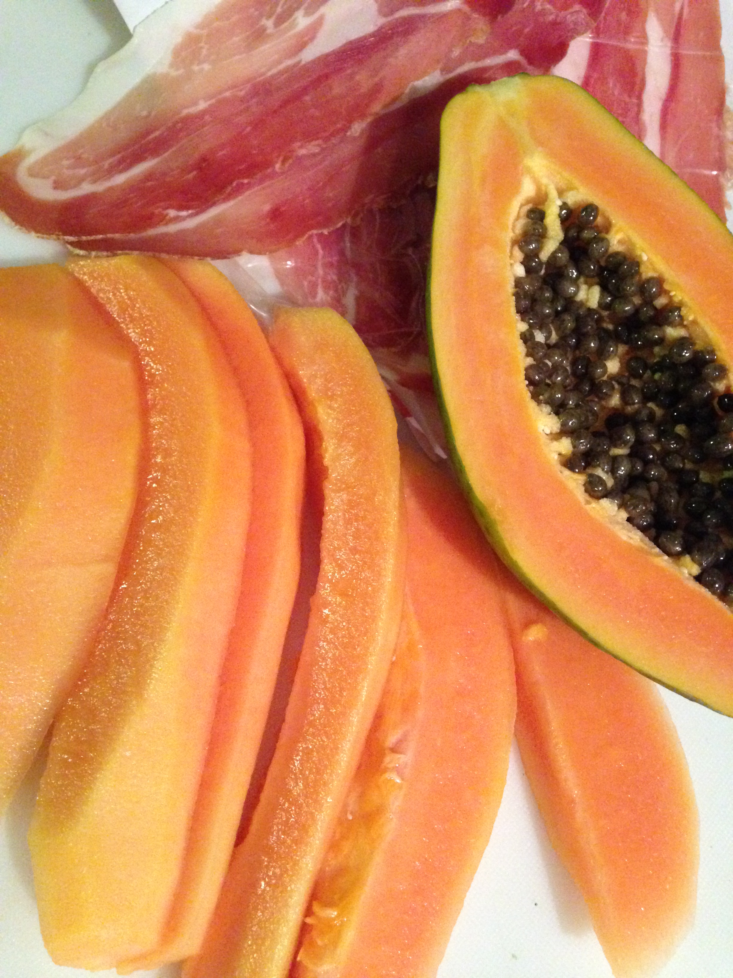Red paw paw slices and prosciutto
